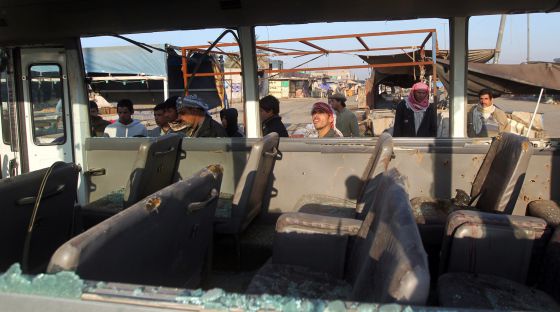 Residentes de Ciudad Sáder, en Bagdad, caminan junto a un autobús dañado por la explosión de una bomba. /